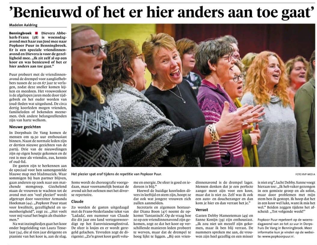 Op woensdagavond 29 januari was het open avond/vriendinnenavond bij Popkoor Puur. Iedereen die zich altijd al heeft afgevraagd of zingen bij een koor iets voor haar was, kon vrijblijvend mee komen zingen. Dirigente Laura Tesselaar had een speciaal programma gemaakt, zodat ook de gasten lekker mee konden doen.